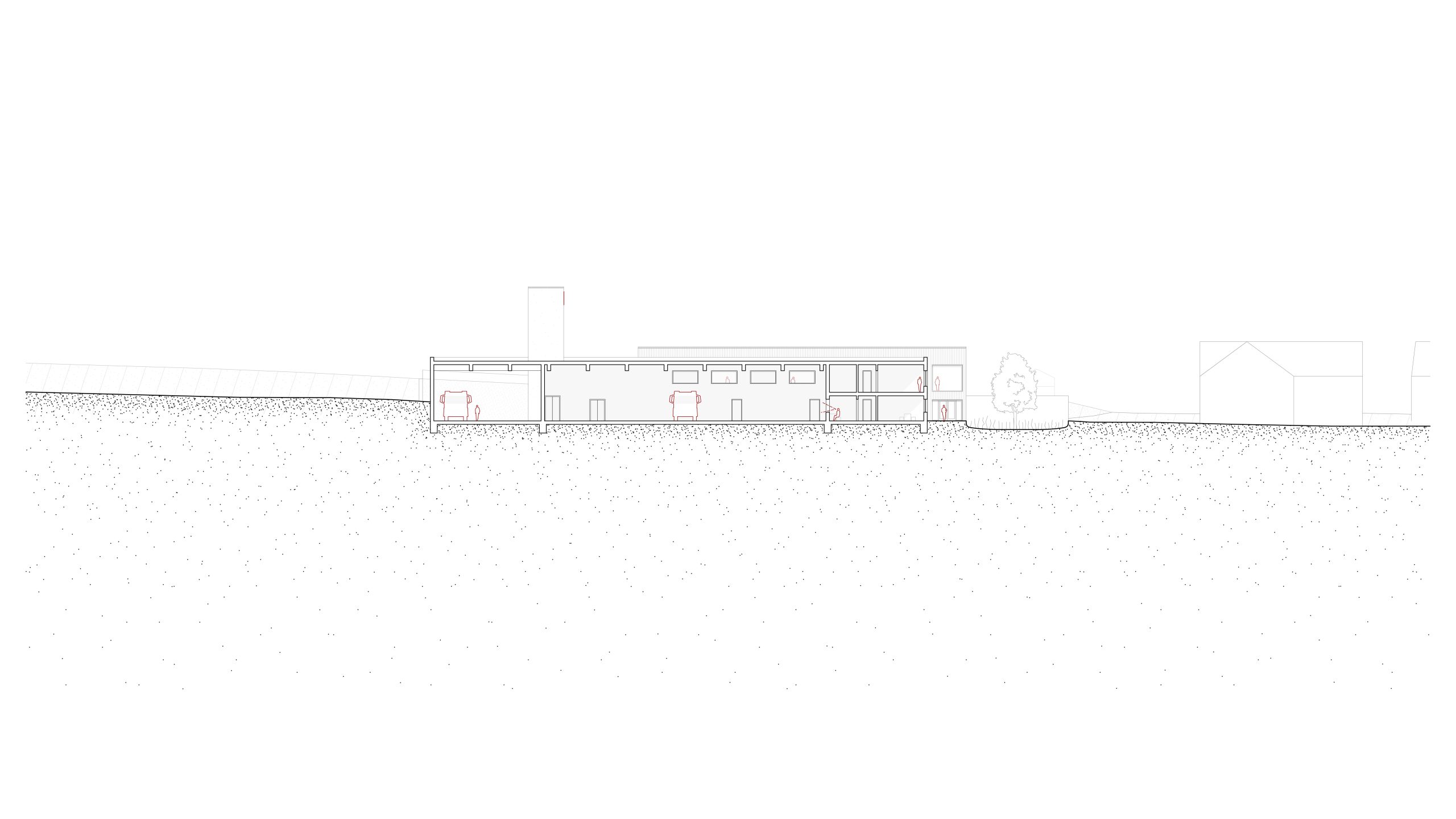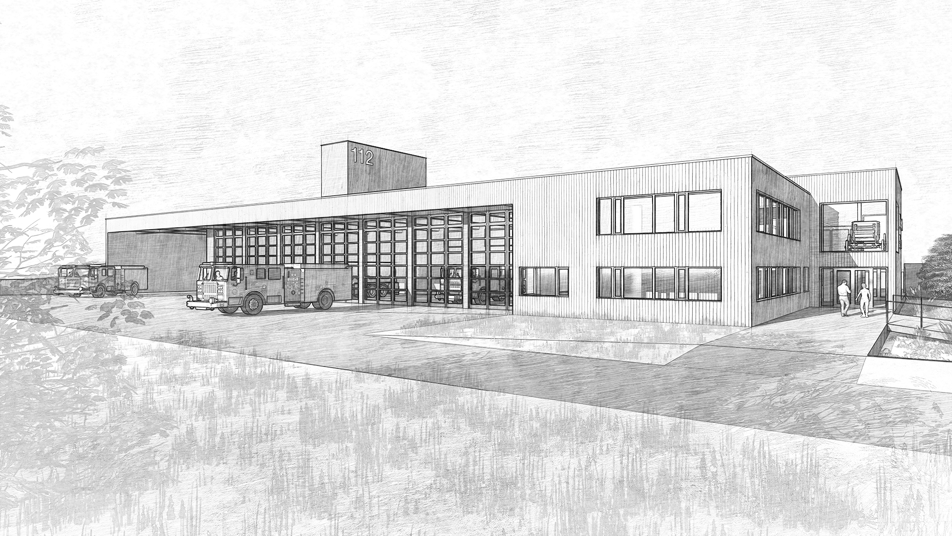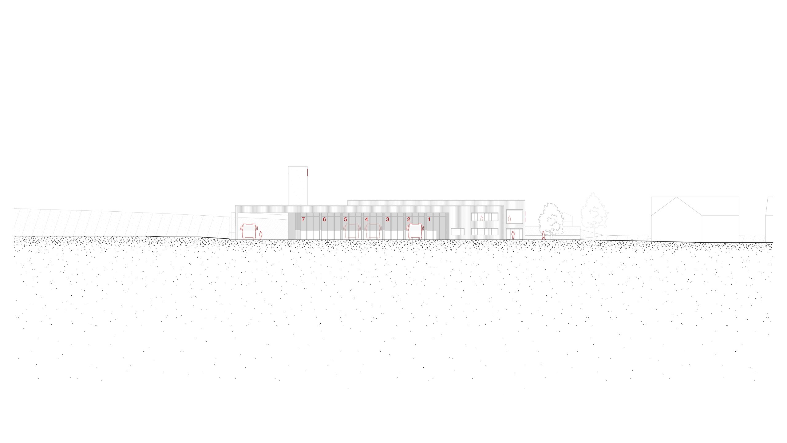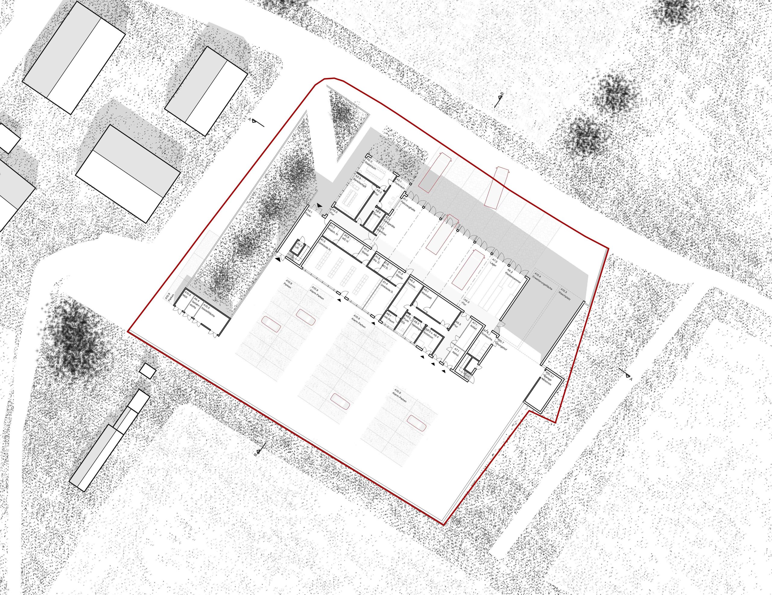 Der Baukörper der Feuerwehr ist in zwei unterschiedlich hohe Spangen gegliedert, die leicht gegeneinander verschoben sind. Dadurch bildet sich im Nord-Westen eine einladende Eingangssituation. Die Rückhaltemulde verläuft parallel zur Stichstraße und erzeugt mit ihrer Begrünung eine Abtrennung zur Wohnbebauung. Eine Brücke über die Mulde verbindet die Kreuzung direkt mit dem Eingang. Die Einfahrt auf das Gelände erfolgt über die neue Stichstraße im Westen. Da alle einsatzbezogenen Räume und Flächen auf einer Ebene liegen, werden auch die Parkplätze und der Übungshof in das ansteigende Gelände eingelassen. Das eher flach gehaltene Gebäude bildet mit der Übungsfassade einen Hochpunkt, der die Funktion der Feuerwehr zeigt.
